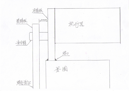 2.3.1.測量容器殼體齒圈的內齒面距密封面距離的1/2處到釜體斷面的實際尺寸,在齒圈外壁上畫安全銷縱中心線。